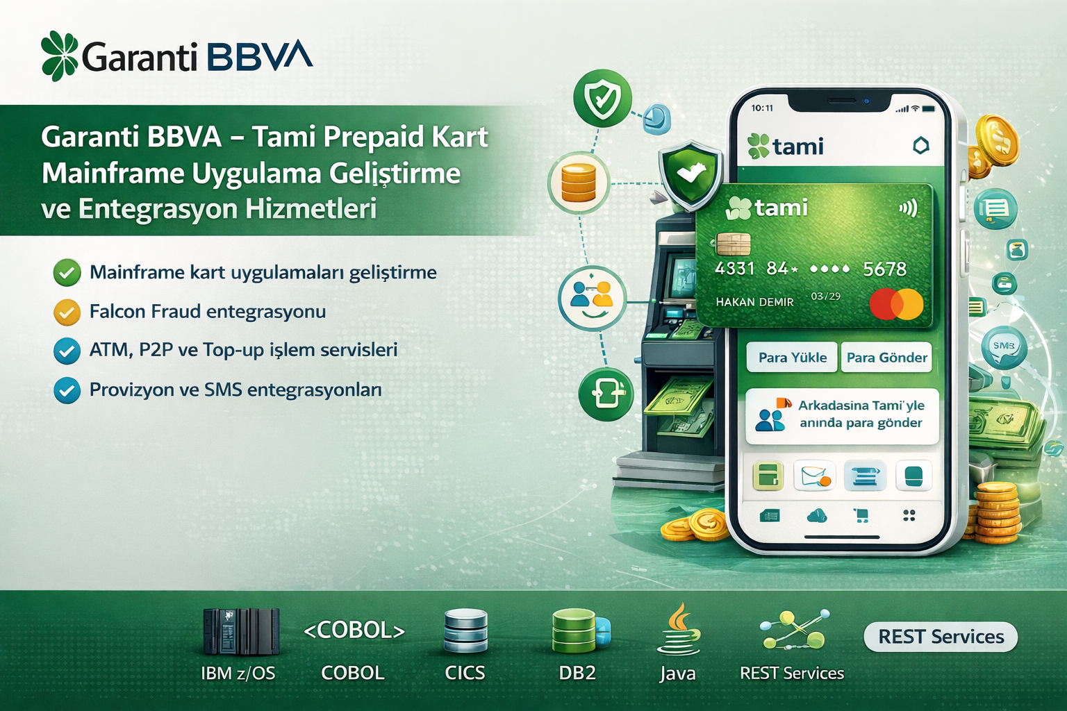 Garanti BBVA'nın Tami Prepaid Kart platformu kapsamında, kart işlemlerini destekleyen Mainframe tabanlı uygulamaların geliştirilmesi, entegrasyonu ve modern servis mimarisi ile uyumlu hale getirilmesi süreçlerinde uygulama geliştirme hizmetleri sağlanmıştır.